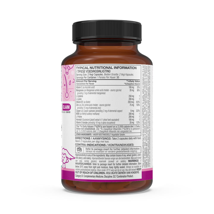 | WARNINGS: Refer to package insert for further detailed information. These products are not intended to diagnose, treat, cure, or prevent any disease. Health supplements are intended to complement health or supplement diet. Store below 25°C away from light and moisture. Keep tightly sealed. Keep out of reach of children. Category D: Complementary Medicine. Discipline: 33.7 Combination Product. NAPPI Code: 3005246001 |